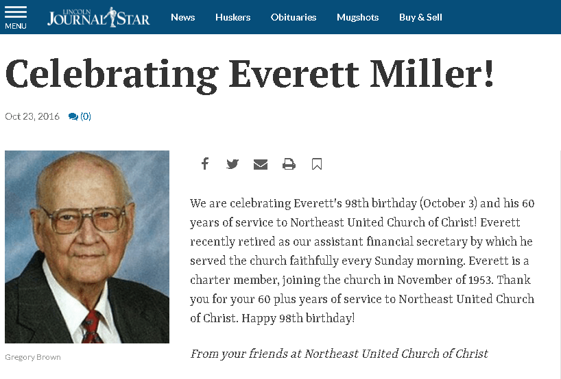 In 2016 Northeast Community Church honored Everett with a short article in the Lincoln Journal Star newspaper. See image below.