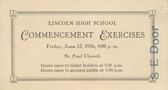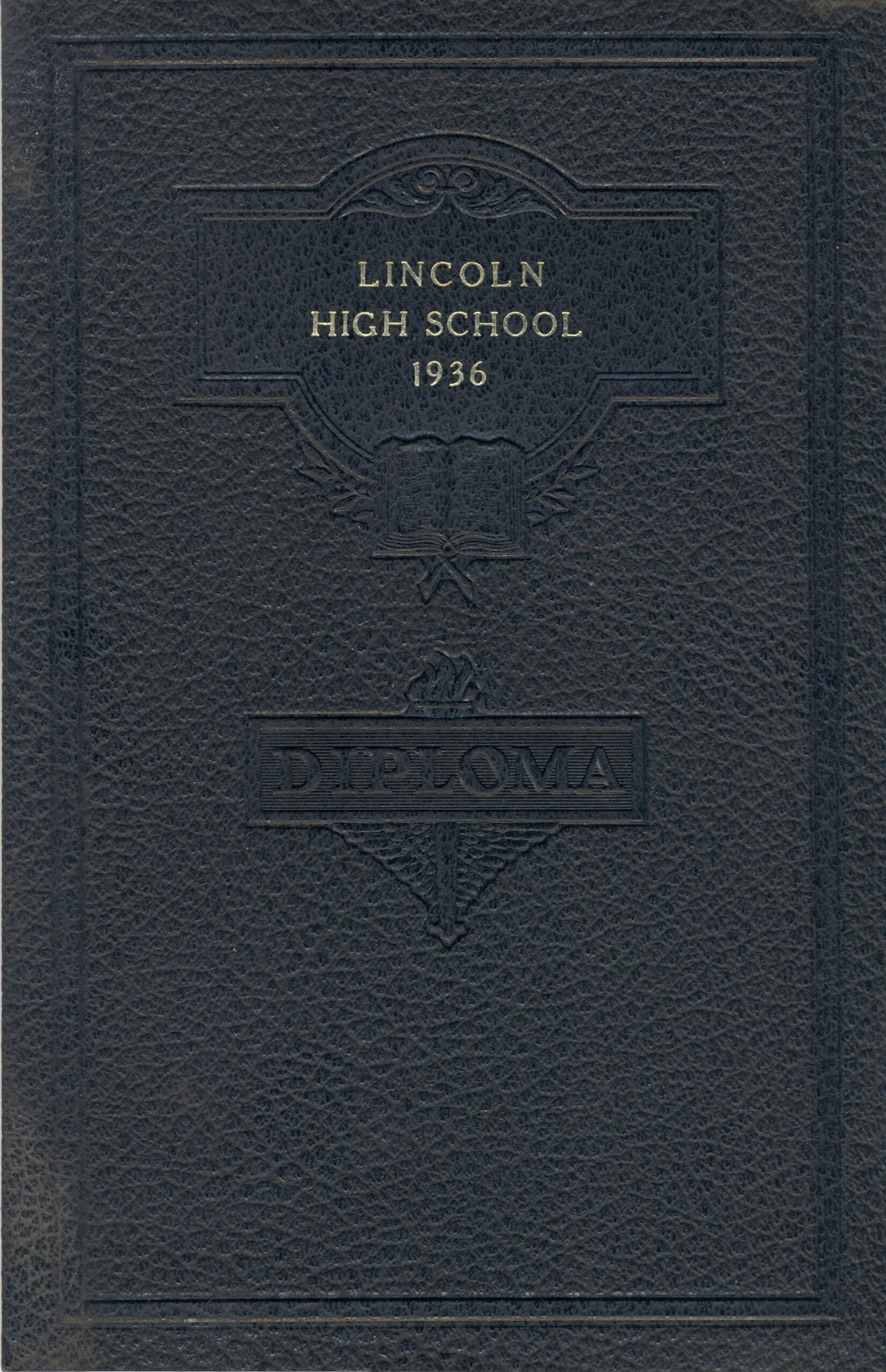 Everett attended Lincoln High School and graduated in 1936. The three images below show a ticket to the graduation ceremony, the black cover for the diploma, and the diploma that folks in half inside the black cover.
